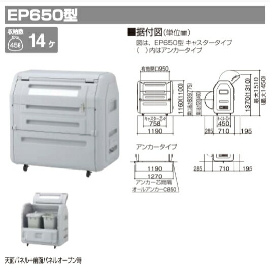 メーカー四国化成サイズ間口1,190×奥行710×高さ:キャスタータイプ1,160mm、アンカータイプ1,100mm容量650L 45Lゴミ袋収納数:約14個材質/特徴ポリエチレン(再生材40%使用)送料・支払い方法全国送料無料 ※この商品はメーカー・工場からの直送になりますので、代金引換はご利用いただけません。