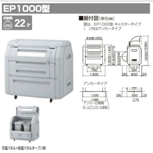 メーカー四国化成 EP1000型 内容器なしタイプサイズ間口1,300×奥行850×高さ:キャスタータイプ1,200mm、アンカータイプ1,140mm容量980L 45Lゴミ袋収納数:約22個材質/特徴ポリエチレン(再生材40%使用)送料・支払い方法全国送料無料 ※この商品はメーカー・工場からの直送になりますので、代金引換はご利用いただけません。
