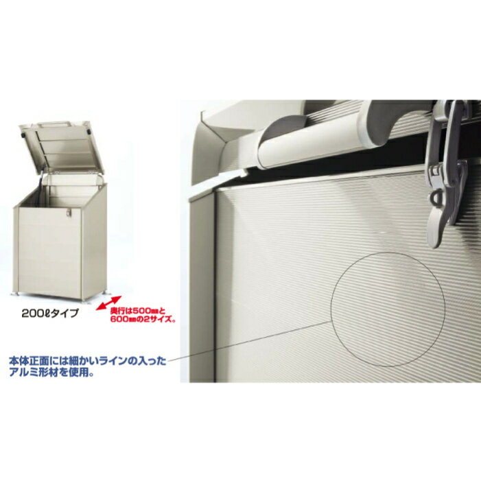 メーカー四国化成サイズ間口700×奥行500×高さ1,132mm容量200L 45Lゴミ袋収納数:約4個材質/特徴[本体]アルミ押出形材 (陽極酸化・塗装複合皮膜)送料/支払い方法全国送料無料 ※この商品はメーカー・工場からの直送になりますので、代金引換はご利用いただけません。