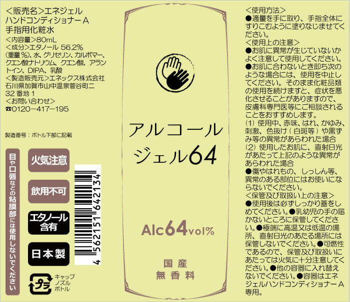 (法令による保管場所・保管量の制限、許可申請手続きなどは不要です) <商品規格> 品名:エネジェル ハンドコンディショナーA 手指用化粧水 内容量:80ml 成分(重量%):エタノール 56.2%、水、グリセリン、カルボマー、クエン酸ナトリウム、クエン酸、アラントイン、DIPA、乳酸 製造販売元:エネックス株式会社 石川県加賀市山中温泉菅谷町ニ32番地1 使用方法と使用上の注意等 <使用方法> ・適量を手に取り、手指全体にすりこむように塗りなじませてください。