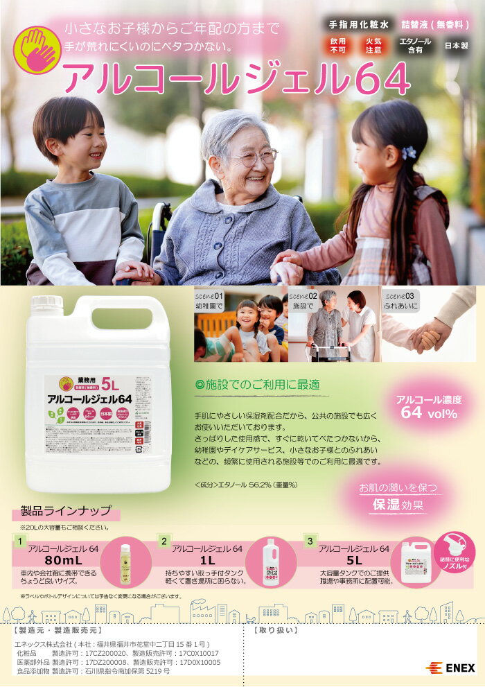 <関連商品> アルコールジェル64 5L アルコールジェル64 1L アルコールジェル64 1L×4本 もございます。